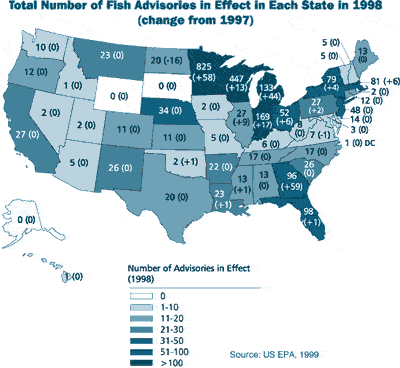 Boating and fishing are intertwined. Whether we are cooking up our own catch, or enjoying a meal at the marina or a shore-side restaurant, the long-term effects of water pollution are increasingly being noticed by scientists, health-care professionals, and the general public. It’s not that things are getting worse in terms of water quality; in many ways the Nation’s water quality is improving. It is just that the effects of bioaccumulation and increasing awareness of the potential dangers have revealed food poisoning from fish and shellfish. In 1998, 2,506 fish consumption advisories or bans were issued in areas where fish were too contaminated to eat.
