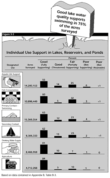 This information was compiled for the Nation’s lakes, rivers, and ponds for the USEPA’s 305(b) Report to Congress. Each water body was only rated in terms of the intended uses, so for example, a dirty urban stream would not be considered as a potential drinking water or agricultural supply. Forty-two states, one tribe, Puerto Rico, and the District of Columbia reported individual use support status of their lakes, reservoirs, and ponds. The reporting states and tribes rated aquatic life use and swimming use in more lakes and identified more impacts on aquatic life use and swimming use than the other individual uses. These states and governments reported that fair or poor water quality impacts aquatic life in over 4.4 million lake acres (31% of the 14.2 million acres surveyed for aquatic life support), and swimming criteria violations impact 3.8 million lake acres (24% of the 15.4 million acres surveyed for swimming use support). Many states and tribes did not rate fish consumption use support because they have not codified fish consumption as a use in their standards.