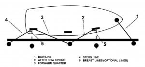 Normally, only these four lines are required when mooring. During times of foul weather, breast lines (#5) may be used to provide additional holding strength. Fenders should be used at strategic points along the hull to prevent chafing against the dock or float.